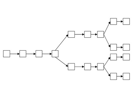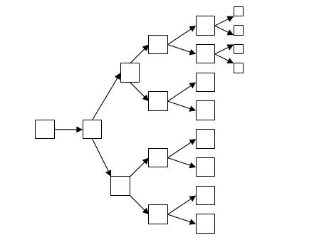 Τώρα, αν αυτό θέλουμε να συνεχιστεί για μια εμπειρία που θα διαρκεί 15 ώρες, είναι εμφανές το μέγεθος των εναλλακτικών “δρόμων” που πρέπει να δημιουργηθούν μαζί με όλα τα στοιχεία που συνεπάγονται. Το παραπάνω θα ήταν το ιδανικό αλλά είναι εμφανές πως, για πρακτικούς λόγους, η δημιουργία μιας τέτοιας ιστορίας είναι μάλλον ουτοπική. Γι’ αυτόν το λόγο, οι περισσότεροι developers περιορίζουν τα αλληλεπιδραστικά “σεναριακά κουτάκια” σε μερικά κομβικά σημεία, στα οποία ο παίκτης θα κληθεί να επιλέξει και να επηρεάσει την ιστορία του παιχνιδιού. Έτσι, το παραπάνω σχήμα θα μετατραπεί σε κάτι τέτοιο: