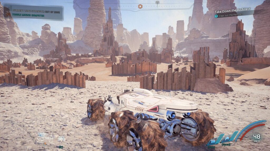 Ε, λοιπόν, το MEA, βρίσκεται κάπου ανάμεσα σε αυτά τα δύο επίπεδα. Δεν βρίσκεται σε “broken” χάλια, που χάνονται saves, χαρακτήρες πετούν στο διάστημα, καταστρέφονται main quest κλπ, αλλά δεν βρίσκεται και στα πιο ομαλά επίπεδα που θα τα θεωρούσαμε αποδεκτά. Πέρα από τα θεματάκια του scripting και του βιαστικού facial animation, θα βρεθείτε αντιμέτωποι με διάφορα άλλα προβληματάκια. Quest marker που κολλάει και δεν φεύγει από το χάρτη, εχθροί που ίπτανται κάποια μέτρα πάνω από το έδαφος, Α.Ι. που δεν “παίρνει μπρος”, με αποτέλεσμα να θερίζετε την εχθρική βάση δίχως κιχ, χαρακτήρες να κάνουν σπασμένα animation και να κινούνται πολύ γρήγορα ή να περνούν μέσα από αντικείμενα κλπ. Με το τελευταίο patch παρατηρήσαμε μια κάποια βελτίωση, αλλά γενικά, είναι ντροπή να κυκλοφορεί τίτλος με γιγάντιο budget και 5 χρόνια στην παραγωγή και να έχει τόσα πολλά μικροθεματάκια, θεματάκια που σίγουρα θα διορθωθούν μέσα σε μερικούς μήνες με patches, αλλά που πραγματικά έπρεπε να είχαν προσεχθεί εξ αρχής.