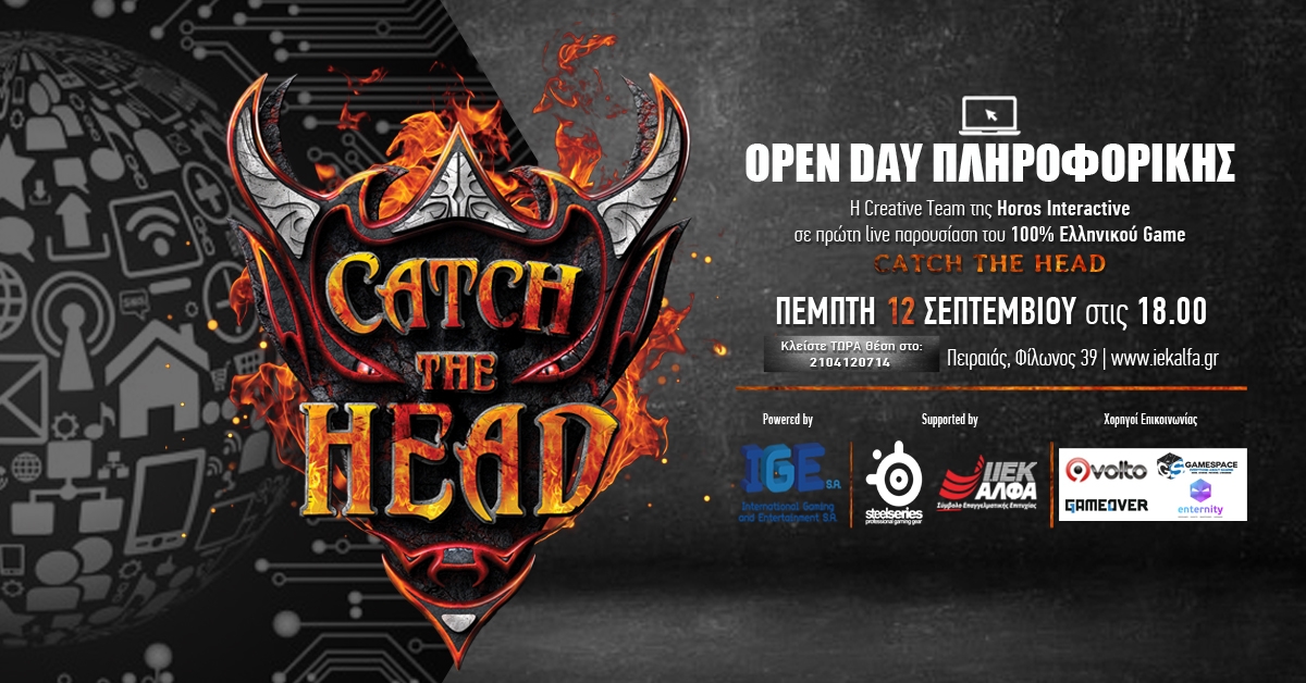 Μια “open day” για το κοινό, μια ημέρα ελεύθερης πρόσβασης στο παιχνίδι Catch the Head της Horos Interactive έχει προγραμματιστεί για τις 12 Σεπτεμβρίου. Μέσα από αυτήν την εκδήλωση, τα στελέχη της ομάδας που ανέπτυξε το Catch the Head θα μιλήσουν για το παιχνίδι, την πορεία της δημιουργίας του, θα απαντήσουν σε ερωτήσεις του κοινού και θα προχωρήσουν σε παρουσίασή του.