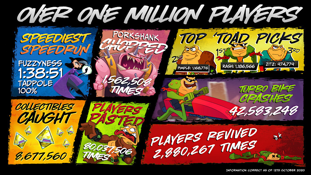 Οι Rare και Dlala Studios μοιραστήκαν ορισμένα στατιστικά στοιχεία του νέου Battletoads, καθώς ο τίτλος έχει πλέον ξεπεράσει το ορόσημο του 1 εκατομμυρίου παικτών, δύο μήνες μόλις μετά τη διάθεσή του τον περασμένο Αύγουστο.