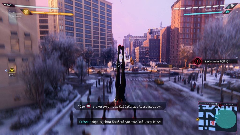 Μιλάμε για πράγματα που ούτε τα cartridges που χρησιμοποιούνταν σε παλιές κονσόλες δεν κατάφερναν. Αυτό είναι το πραγματικό “game changer” για τη γενιά hardware που μόλις ξεκίνησε. Τέλος, η χρήση της τεχνολογίας haptic feedback και των adaptive triggers του DualSense είναι διακριτική (όπως μάς είχε πει και ο Cameron Christian, ο director του τίτλου, στη συνέντευξη που μας παραχώρησε), χωρίς ποτέ να γίνεται υπερβολική ή ενοχλητική. Έχουμε βεβαίως και έναν υπέροχο ήχο, που με τη χρήση της τεχνολογίας 3D audio δίνει ζωή στην ψηφιακή Νέα Υόρκη του Miles Morales, ενώ, τέλος, αξίζει να αναφέρουμε ότι για μια ακόμα φορά έχουμε ένα παιχνίδι της Sony μεταφρασμένο στα ελληνικά, και πάλι με εξαιρετικά αποτελέσματα.