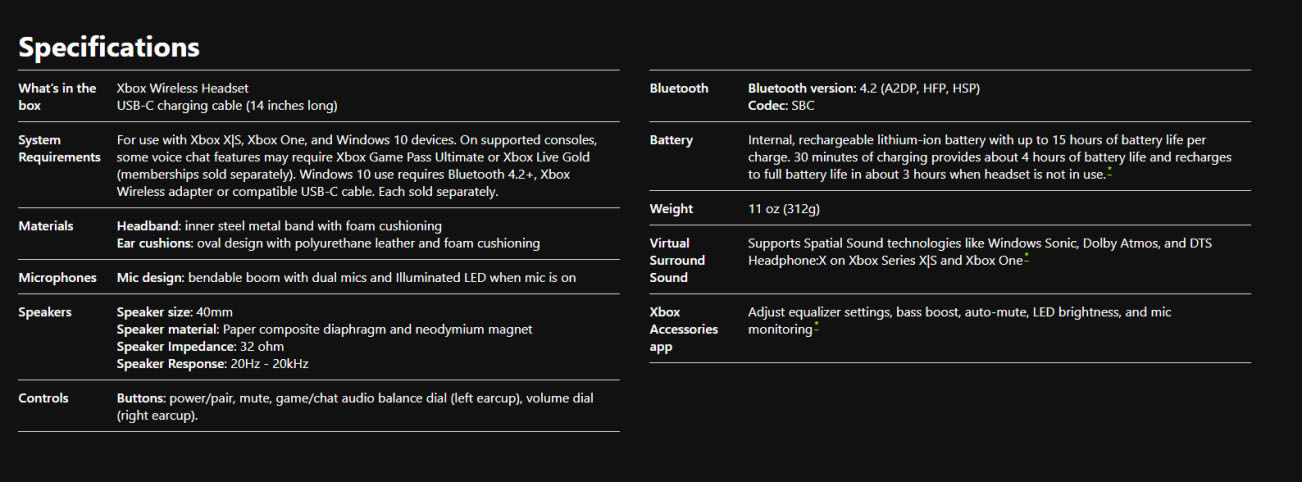 Λαμβάνοντας υπόψη τον σχεδιασμό των Xbox Series X και Series S, το headset αντικατοπτρίζει επίσης τη γεωμετρία των νέων κονσολών, αν και θα μπορούμε να χρησιμοποιήσουμε το νέο περιφερειακό σε Xbox Series X/S, Xbox One και Windows 10 PC, όπως καθώς και άλλες Bluetooth φορητές συσκευές. Η μπαταρία του headset παρέχει διάρκεια ζωής που μπορεί να φτάσει έως και τις 15 ώρες με 3 ώρες φόρτισης, ενώ η γρήγορη φόρτιση 30 λεπτών θα παρέχει περίπου 4 ώρες λειτουργίας.