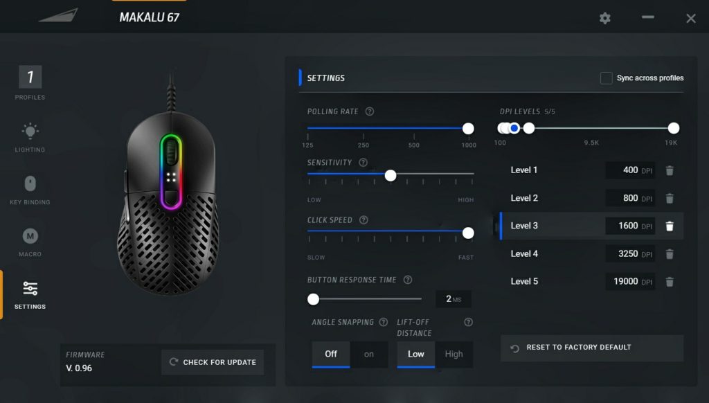 Μέσα από αυτό μπορούμε να ρυθμίσουμε τα πάντα για το Makalu -από τον RGB φωτισμό του, μέχρι τα macro των κουμπιών του. Φυσικά, ο τομέας που ενδιαφέρει τους περισσότερους είναι η ρύθμιση της συμπεριφοράς του ίδιου του Makalu. Όσον αφορά στη ρύθμιση των DPI, αυτή έχει εύρος από 100 έως και 19.000 (αύξηση ανά 50 μέχρι τα 10.000 DPI και έπειτα ανά 100). Παράλληλα, ο χρήστης μπορεί να ρυθμίσει το Button Response Time από 2 έως 12ms, το poling rate (από 125 έως 1000Hz) και το lift off distance (υψηλό/ χαμηλό).
