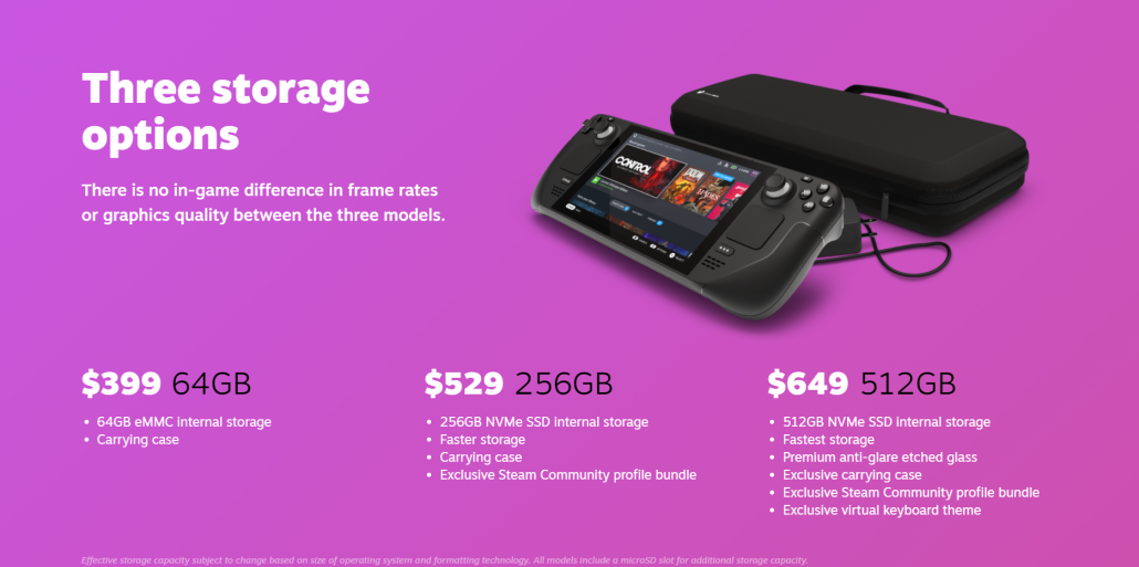 Η Valve ανακοίνωσε το Steam Deck, ένα all-in-one portable PC σύστημα, με κυκλοφορία τον ερχόμενο Δεκέμβριο σε τρεις διαφορετικές εκδόσεις και με τιμή εκκίνησης τα $399 για την απλή έκδοση. Το Steam Deck θα τρέχει το Steam OS 3.0 και θα επιτρέπει στους παίκτες να έχουν πρόσβαση σε μια πλήρη Steam gaming εμπειρία σε μια φορητή πλατφόρμα.