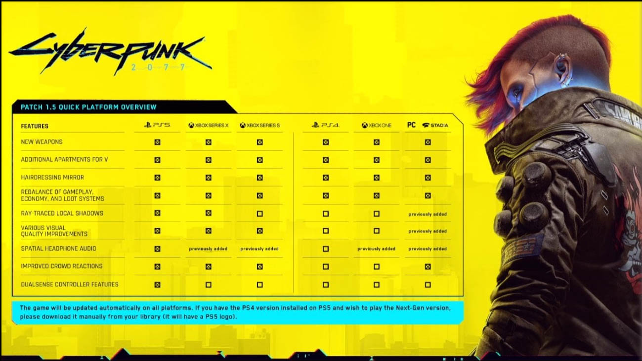 Οι κάτοχοι του τίτλου στο Xbox One μπορούν να αποκτήσουν πρόσβαση στην Xbox Series X/S έκδοση του Cyberpunk 2077 μέσω της λειτουργίας Smart Delivery μόλις γίνει λήψη του Patch 1.5, με τα save αρχεία να μεταφέρονται αυτόματα. Οι κάτοχοι του τίτλου στο PlayStation 4, μπορούν να αποκτήσουν πρόσβαση στην έκδοση τουPlayStation 5 μέσω του PlayStation Store, η οποία πρέπει να ληφθεί ξεχωριστά. Στη συνέχεια, τα αρχεία αποθήκευσης μπορούν να μεταφερθούν από το PlayStation 4 στο PlayStation 5, με λεπτομέρειες για την διαδικασία να είναι διαθέσιμες στον επίσημο ιστότοπο εδώ.