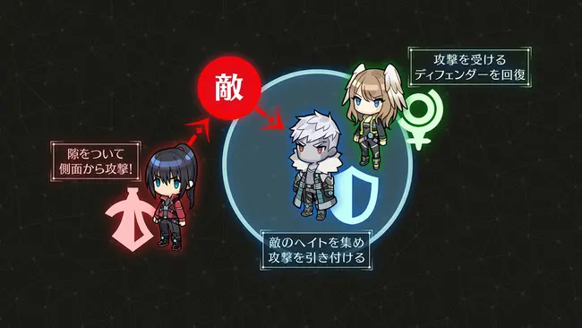 Για αρχή, οι έξι χαρακτήρες που θα απαρτίζουν το party μας θα έχουν διακριτούς ρόλους. Όπως συνέβαινε και στο Xenoblade Chronicles, οι χαρακτήρες θα μοιράζονται τους ρόλους των Attacker, Defender και Healer. Οι Noah και Sena είναι οι Attackers. Οι Attackers θα επικεντρώνονται στο να καταφέρουν ισχυρά χτυπήματα στους αντιπάλους και να έχουν τον έλεγχο της μάχης. Το ρόλο των Defenders αναλαμβάνουν οι Mio και Lanz. Οι Defenders προσπαθούν να τραβάνε την προσοχή των αντιπάλων τους και να δ΄΄ινουν χώρο στους άλλους χαρακτήρες του party. Τέλος, οι Eunie και Taion είναι Healers. Στόχος τους είναι να διατηρούν τη ζωτικότητα των χαρακτήρων σε υψηλά επίπεδα, αποτρέποντας ένα πρώιμο… τέλος.