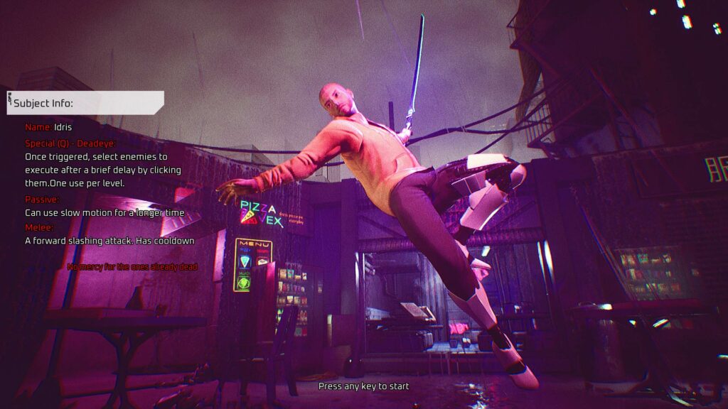 Το μόνο που καταφέρουμε να καταλάβουμε είναι πως βρισκόμαστε σε έναν cyberpunk κόσμο. Από εκεί και ύστερα δεν έγινε ποτέ σαφές αν τα κείμενα που βλέπαμε μεταξύ των αποστολών προέρχονταν από κάποιον άυλο αφηγητή, από κάποιον χαρακτήρα εντός του κόσμου ή από κάποια A.I. Δεν καταλάβαμε επίσης ποιοι ήταν αυτοί που σκοτώναμε και γιατί τους σκοτώναμε. Δεν αντιληφθήκαμε ποτέ τι ρόλο εξυπηρετούν οι τρεις διαφορετικοί χαρακτήρες και αν ένας από αυτούς (μπορεί και οι τρεις) ήταν άνθρωποι ή ανδροειδή.
