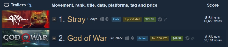 Με αυτή του τη βαθμολογία το Stray προσπέρασε την έκδοση του God οf War για PC, η οποία μέχρι πρότινος βρισκόταν στη πρώτη θέση της λίστας με συνολική βαθμολογία 8.56 (βασισμένη σε 53.101 ψήφους εκ των οποίων το 97% είναι θετικές). Ταυτόχρονα, ο τίτλος έφτασε ήδη στην 49η θέση της λίστας με τους πιο πετυχημένους τίτλους όλως των εποχών για το Steam βάσει των βαθμολογιών των χρηστών. Στην πρώτη θέση της λίστας αυτής συνεχίζει να βρίσκεται το Portal 2, με συνολική βαθμολογία 8,83 (βάση 301.930 ψήφων, εκ των οποίων το 99% είναι θετικές), ενώ το ακολουθούν τα: Terraria, Stardew Valley, Hades και People Playground.