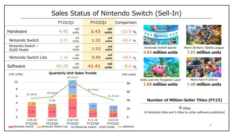 Κατά το πρώτο τρίμηνο του έτους (Απρίλιος έως Ιούνιος 2022), το Nintendo Switch Sports (το οποίο κυκλοφόρησε τον Απρίλιο) έφτασε σε πωλήσεις τα 4,84 εκατομμύρια τεμάχια, και το Mario Strikers: Battle League (που κυκλοφόρησε τον Ιούνιο) έφτασε τα 1,91 εκατομμύρια τεμάχια σε πωλήσεις.