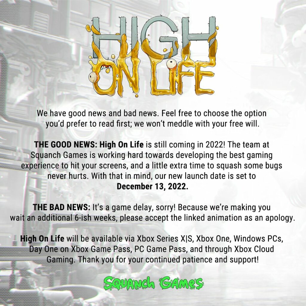 Η Squanch Games ανακοίνωσε μια μικρή καθυστέρηση για το High On Life, τον επερχόμενο FPS τίτλο από τον δημιουργό της σειράς Rick & Morty. Πλέον, από την αρχικά προγραμματισμένη ημερομηνία κυκλοφορίας του στις 25 Οκτωβρίου, η διάθεση του τίτλου μεταφέρεται στις 13 Δεκεμβρίου. Το High on Life θα είναι διαθέσιμο για Xbox Series X|S, Xbox One και PC μέσω του Steam και του Epic Games Store, καθώς και από την πρώτη μέρα κυκλοφορίας του στο Xbox Game Pass.