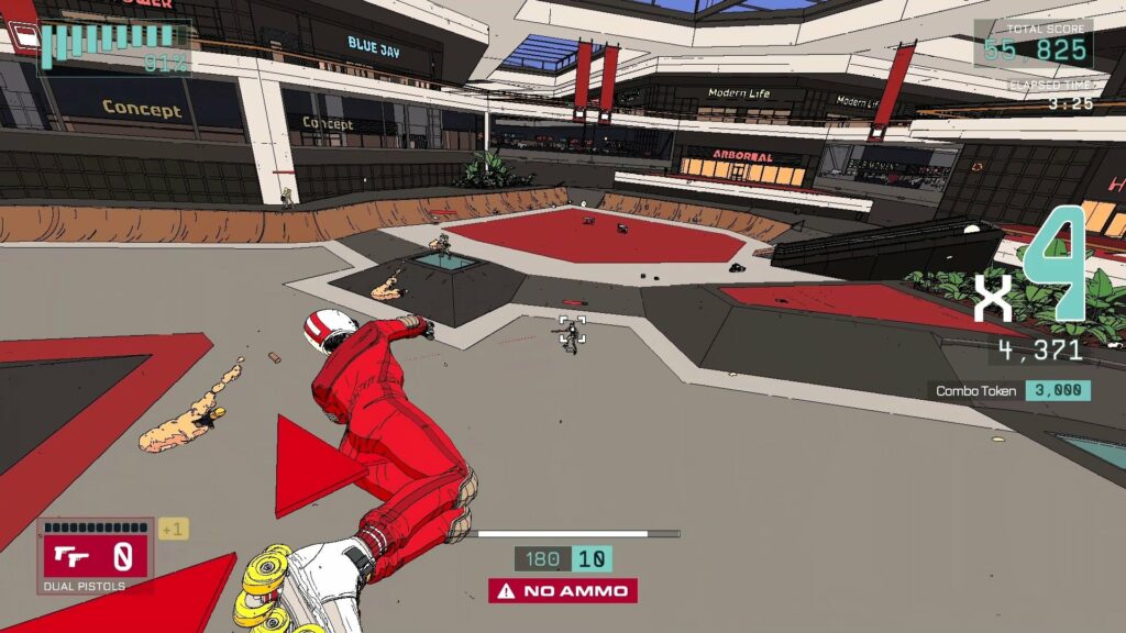 Ως έχει, τουλάχιστον θέτει ένα ταιριαστό υπόβαθρο για τη δράση. Και στο θέμα της δράσης η Roll7 φαίνεται ότι εκμεταλλεύεται πλήρως την έως τώρα εμπειρία της στο θέμα των τρικ, που είχε αποκτήσει μέσω του ασταμάτητου momentum που έφερναν τα OlliOlli. Πραγματικά, η βρετανική ομάδα ανάπτυξης αξίζει τα εύσημα για τη σχεδόν άπταιστη υλοποίηση του gameplay και του συνδυασμού shooting μηχανισμών με τον χειρισμό ενός αθλητή με rollers.