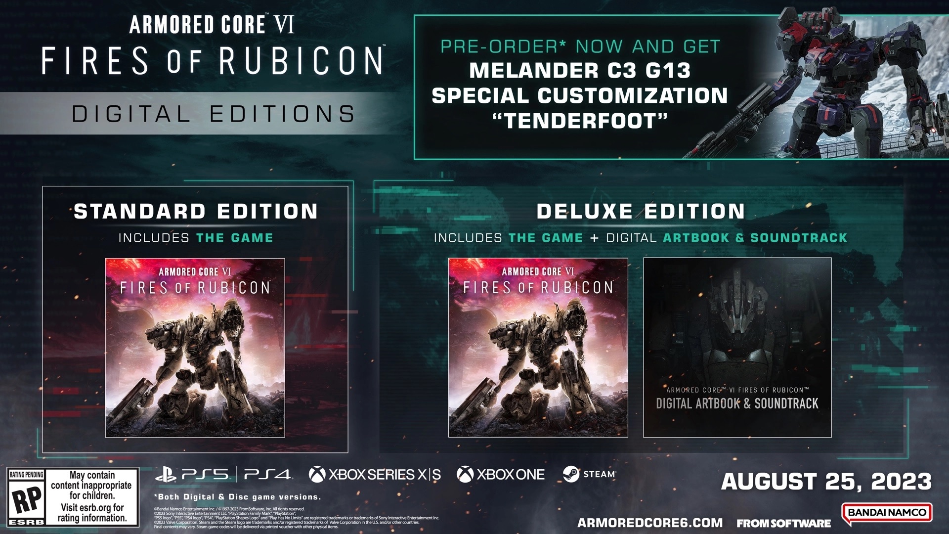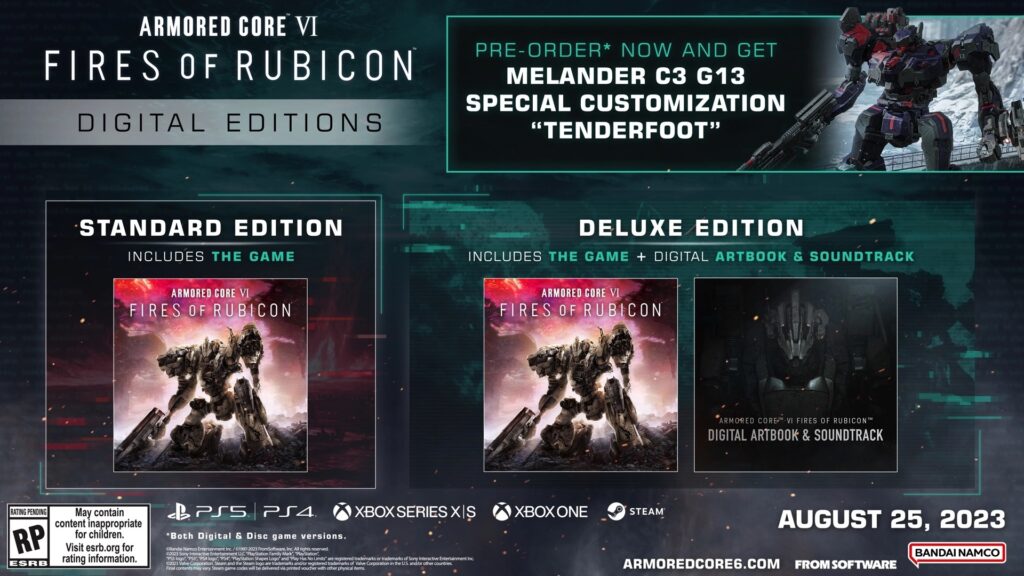 Το Armored Core VI Fires of Rubicon θα γίνει διαθέσιμο για Xbox Series X/S, Xbox One, PlayStation 5, PlayStation 4 και PC στις 25 Αυγούστου. Να σημειώσουμε ότι η δυνατότητα για προπαραγγελία των εκδόσεων του τίτλου (Collector’s Edition, Premium Edition και Digital Editions) είναι διαθέσιμη.