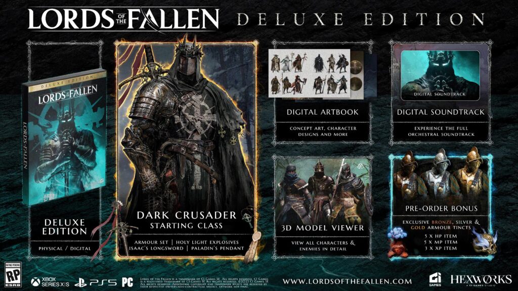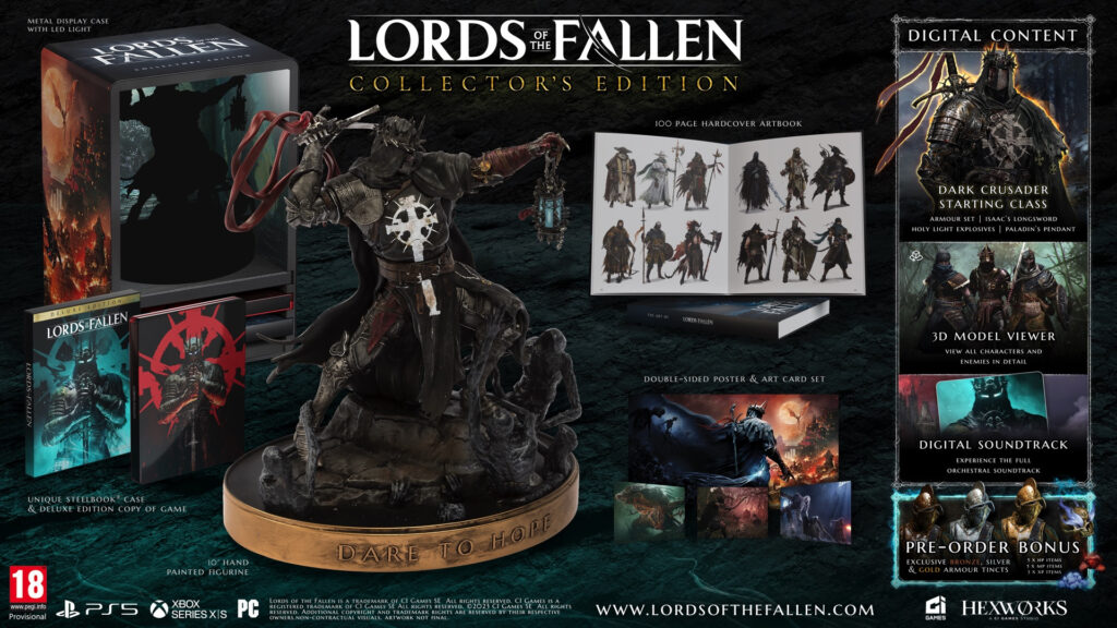 Το Lords of the Fallen θα κυκλοφορήσει σε PlayStation 5, PC και Xbox Series X/S στις 13 Οκτωβρίου, σε τρεις εκδόσεις -Standard, Deluxe και Collector’s Edition. Η Deluxe Edition θα περιλαμβάνει τον Dark Crusader ως starting class, ένα digital artbook 100 σελίδων, το soundtrack σε ψηφιακή μορφή και ένα 3D model viewer. Όσοι προμηθευτούν την Collector’s Edition, θα βρουν όλο το περιεχόμενο της Deluxe Edition, συν ένα αγαλματάκι του Dark Crusader 10 εκατοστών, ένα metal display case, ένα συλλεκτικό steelbook, μια αφίσα, art cards  και ένα artbook 100 σελίδων σε φυσική μορφή.