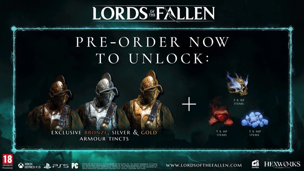 Όλες οι προπαραγγελίες του Lords of the Fallen θα περιλαμβάνουν τα αποκλειστικά Bronze, Silver και Gold Armor tincts και διαφορα αντικείμενα 3x XP, 5x HP και 5x MP.