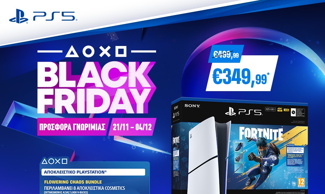 Επίσης, για την φετινή εορταστική περίοδο, έχουμε μια νέα προσθήκη με την κονσόλα PS5 – Fortnite Flowering Chaos Bundle που περιλαμβάνει αποκλειστικό* in-game περιεχόμενο και in-game currency – διαθέσιμο επίσης σε προσφορά γνωριμίας από €349,99*.