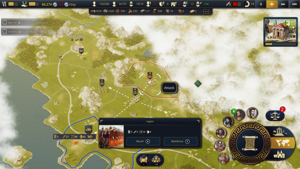 Θα ακολουθήσουμε την εμπορική οδό, ή την οδό του πολέμου; Θα εστιάσουμε στην ανάπτυξη εμπορικών οδών και την ανταλλαγή εμπορευμάτων από και προς άλλες κοινότητες (ακόμα και τη Ρώμη), ή στην ανάπτυξη στρατευμάτων που θα οργώσουν τον χάρτη εκτός πόλης και θα κάνουν έντονη επίδειξη της δύναμής τους; Για να φτάσουμε, ωστόσο, σε αυτό το σημείο, οφείλουμε να ξεκινήσουμε με μικρά, αλλά με προσεκτικά βήματα.