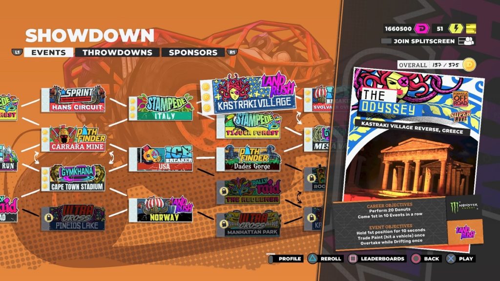 Παρότι το career mode του Dirt 5 είναι ο τομέας που οι περισσότεροι θα ξοδέψουν τον χρόνο τους, μοιάζει πρόχειρο και επιφανειακά στημένο. Στην πραγματικότητα μιλάμε για 120 περίπου events που ξεκλειδώνουν μέσα από ένα “event tree”. Τα events, πλην ελαχίστων εξαιρέσεων, είναι αγώνες τριών γύρων, με 11 αντιπάλους, χωρίς κάποια σύνδεση μεταξύ τους. Ο παίκτης βομβαρδίζεται με αγώνες που τον στέλνουν σε κάθε άκρη της γης, χωρίς να υπάρχει μία σταθερή πρόοδος και εξέλιξη, μεταξύ των κατηγοριών των οχημάτων ή έστω μέσω αυξανόμενης δυσκολίας.